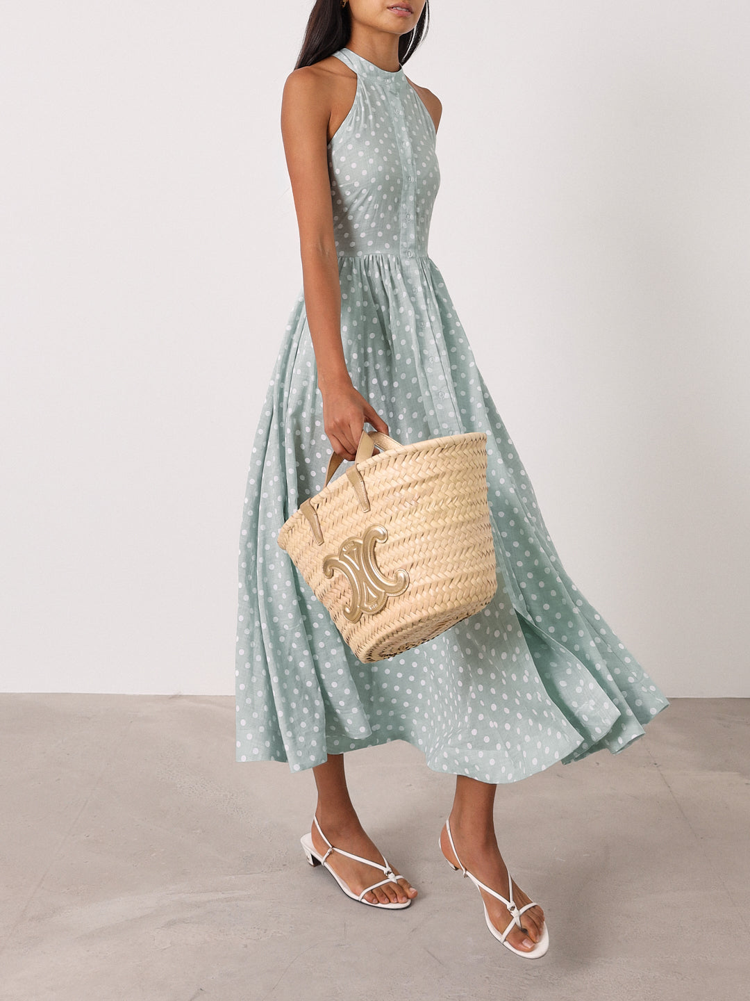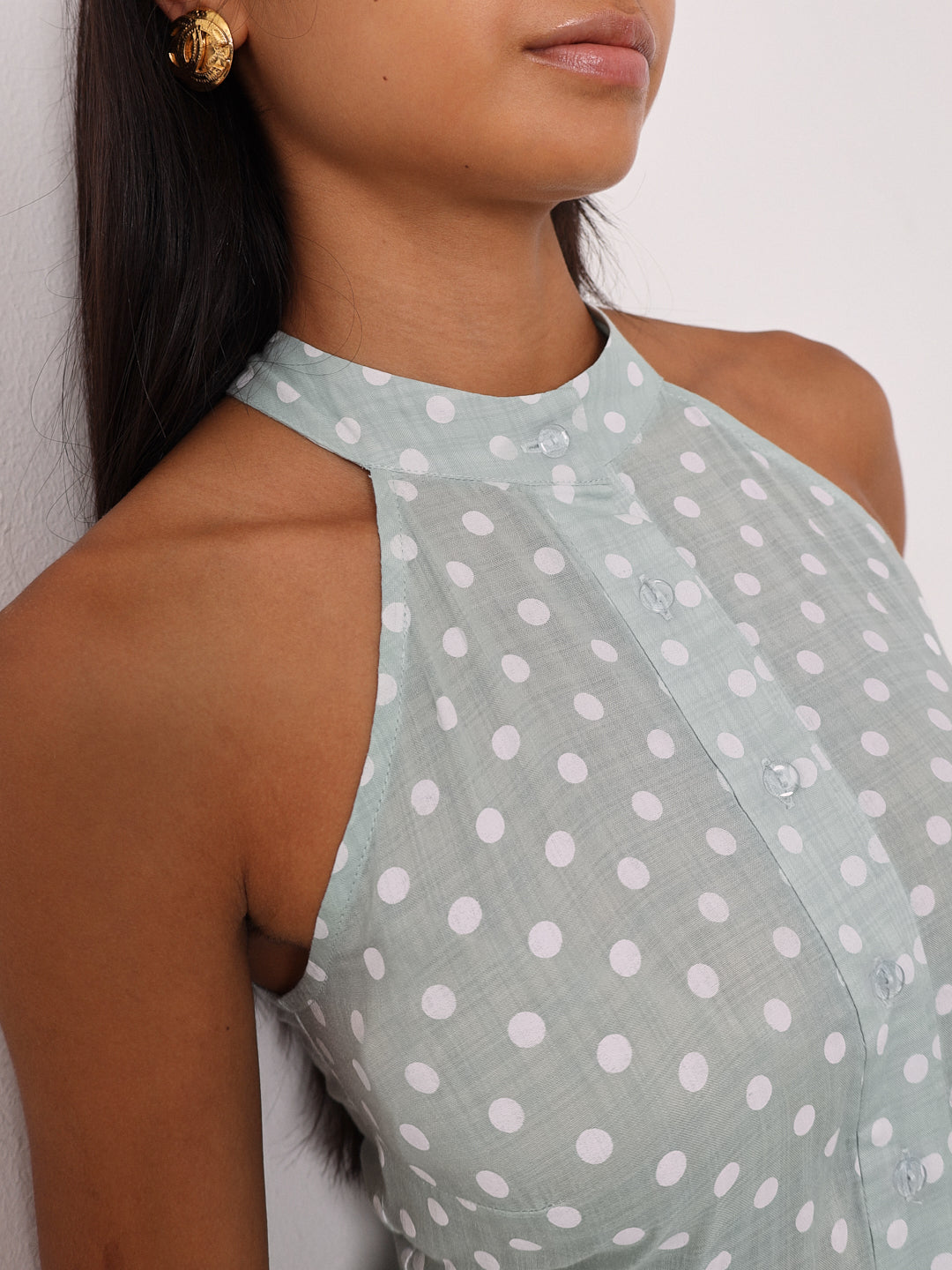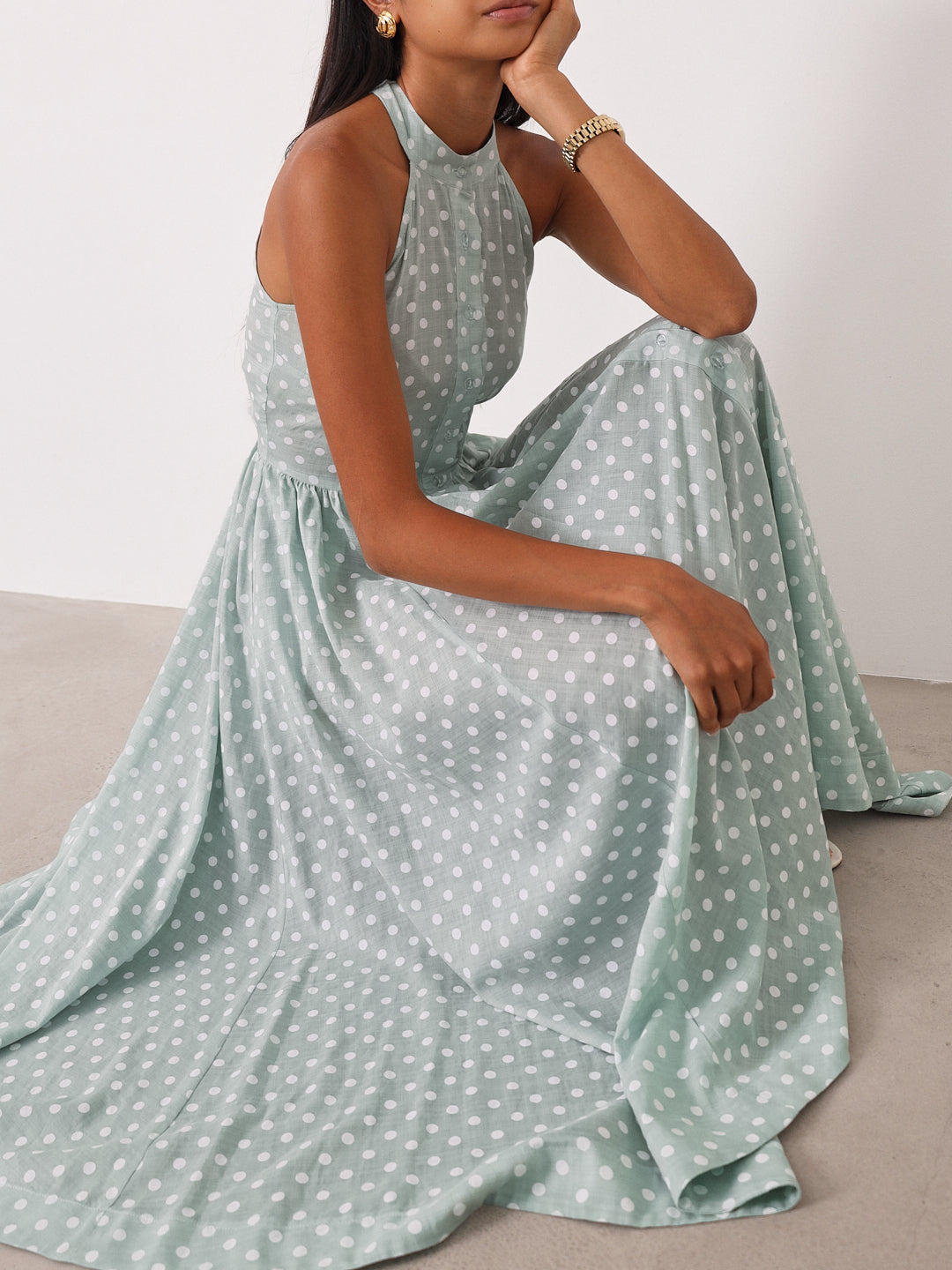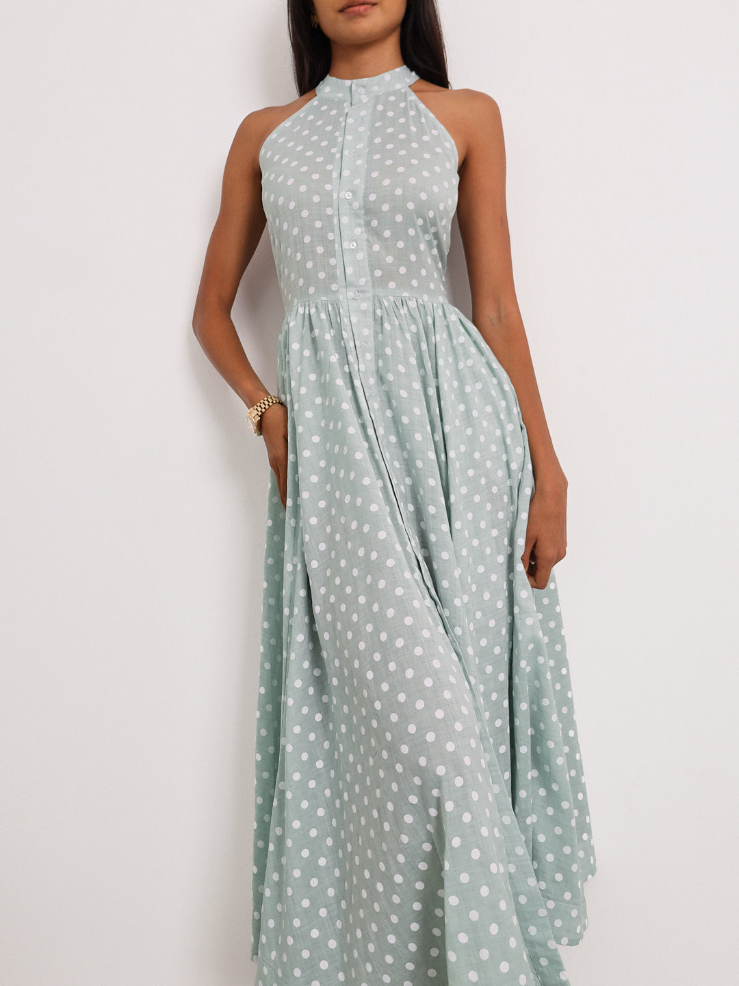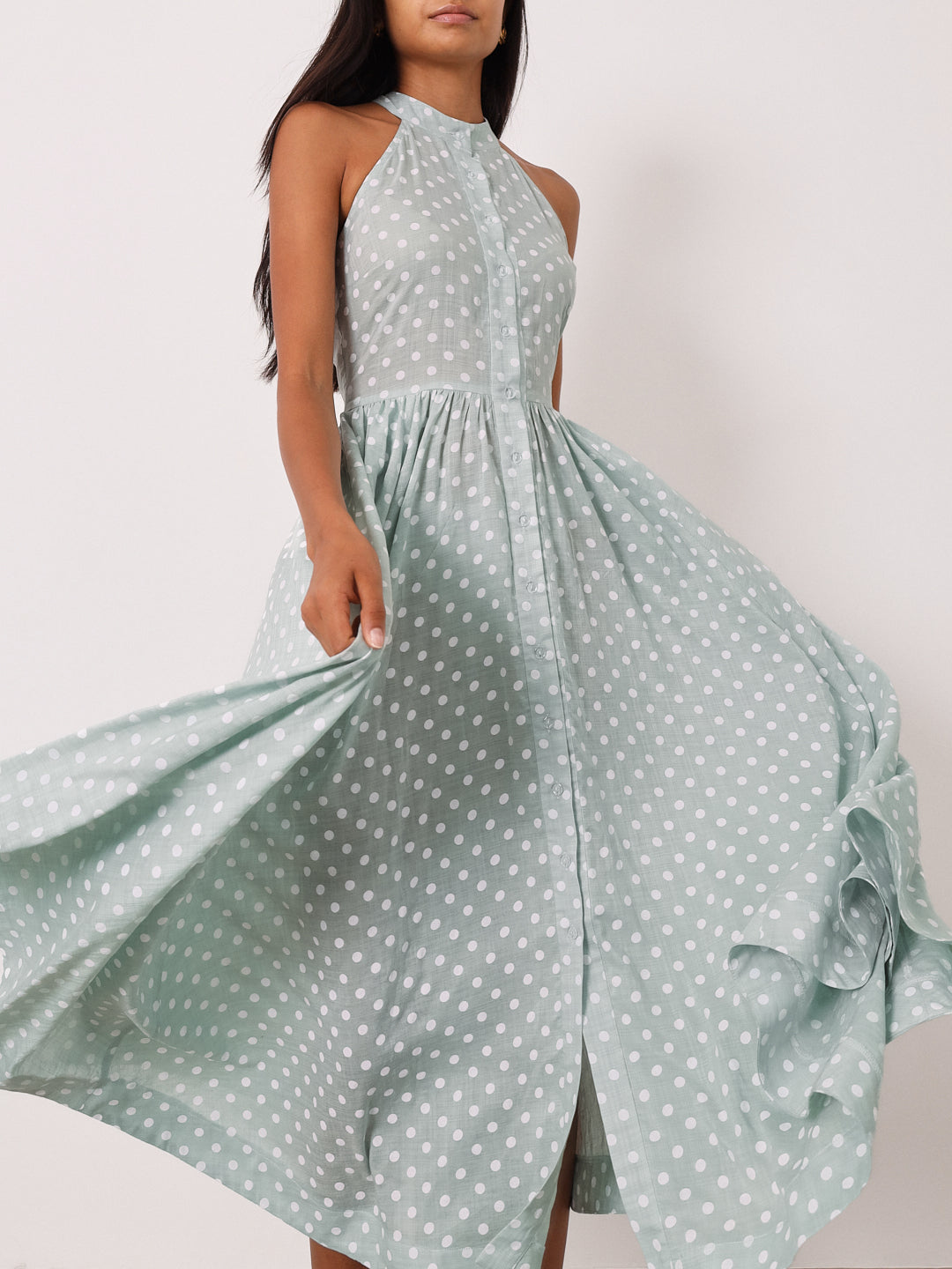 Ontdek de perfecte mix van moeiteloze elegantie en ultiem comfort met de Adriana Dress van Laurea Amsterdam. Deze droomjurk in een zachte pastel pistache met speelse witte polkadots is ontworpen voor die lange zomerdagen die naadloos overgaan in zwoele avonden.