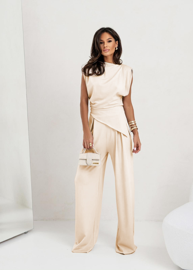 • Details: Draperende top, lichte schouderdetails en elegante wijde pijpen